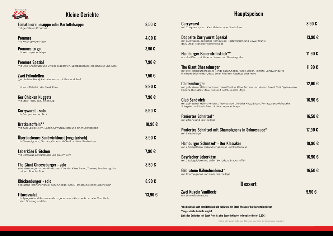 Egal ob Fußballfan oder Sportmuffel hier ist für jeden gesorgt. Wir schnippeln, kochen und braten täglich frisch für euch, egal ob Burger, Schnitzel oder Salat. Wirf mal einen Blick auf unsere leckeren Speisen: